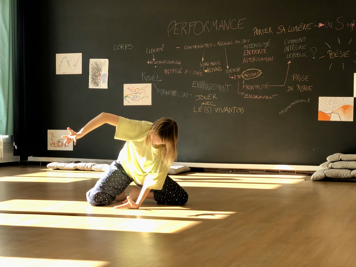 - L’intermodalité des arts pour creuser la matière d’expression : le dessin, la voix et l’écriture comme soutien du corps en mouvement.